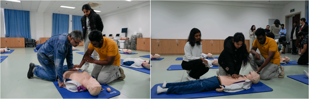 参观的最后,代表团来到急救模拟培训室,学生们详细介绍了急救知识和实操技能,现场模拟了心肺复苏术(CPR)操作,并演示了按压位置、时间控制、深度与频率等关键技巧,邀请代表团进行实践体验,现场气氛十分热烈。