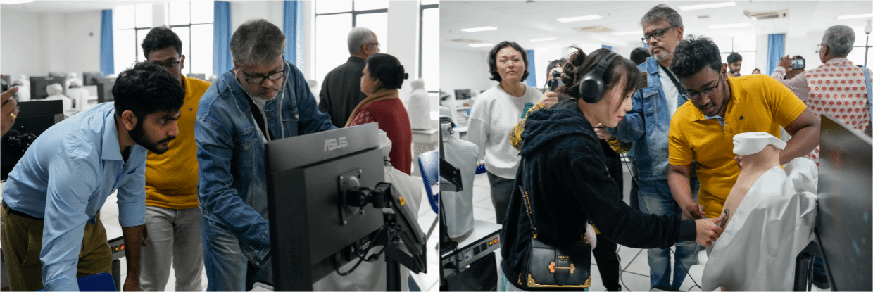 代表团还参观了心肺腹听触诊技能训练教室,学生们在现场讲解了如何通过听诊和触诊对患者进行全面检查,并邀请记者团亲自体验了模拟心跳音的感受。